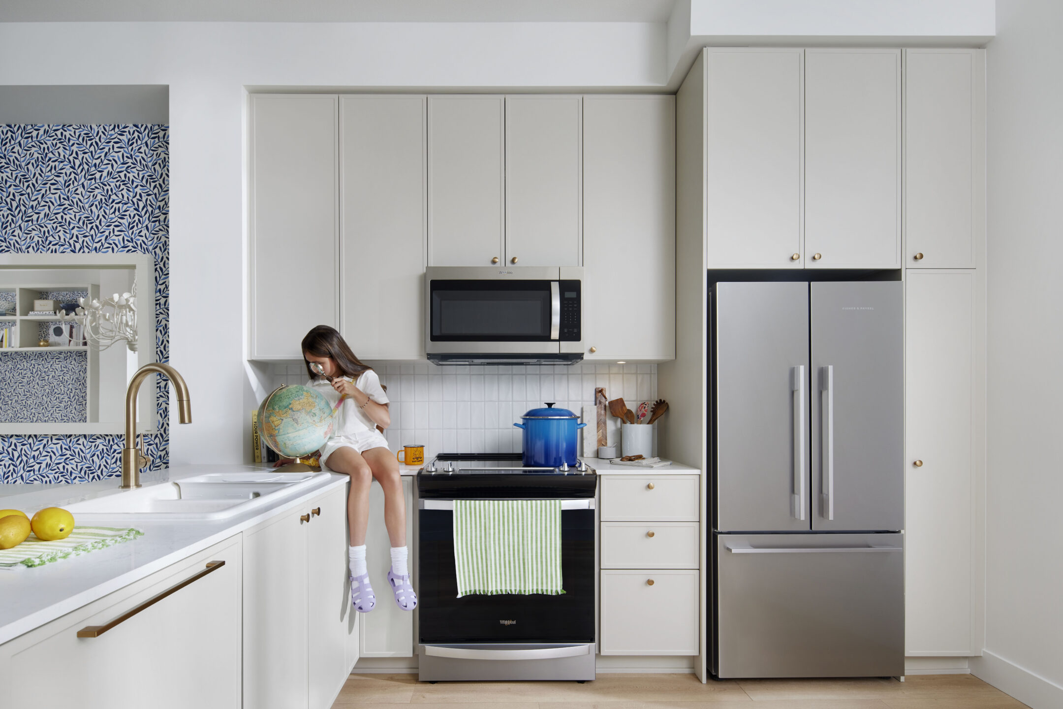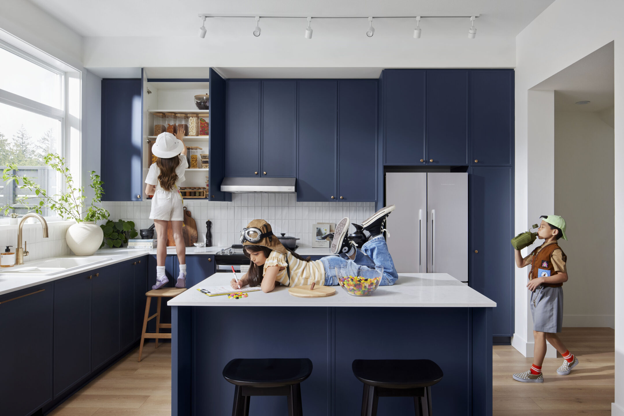 Using every inch so families have more of what they need, this home has two spacious bedrooms with closets on the upper floor along with two full bathrooms – one with a shower, the other with a tub. On the main floor, the 10-ft ceilings and oversized windows create a bright and spacious open plan providing plenty of space for life to unfold. The kitchen was designed for cooking up a storm and the private balcony connects you to the outside. On the tower floor, you’ll find the third bedroom with direct access to a powder room and a closet with plenty of storage.